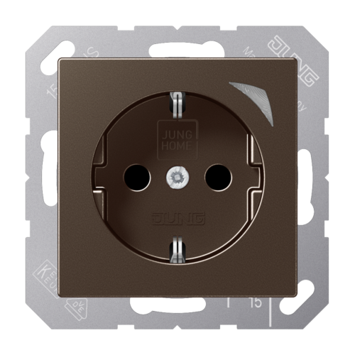 JUNG HOME wandcontactdoos met randaarde met geïntegreerde verhoogde aanrakingsveiligheid (Safety Plus). Uitgevoerd in de kleur mokka.